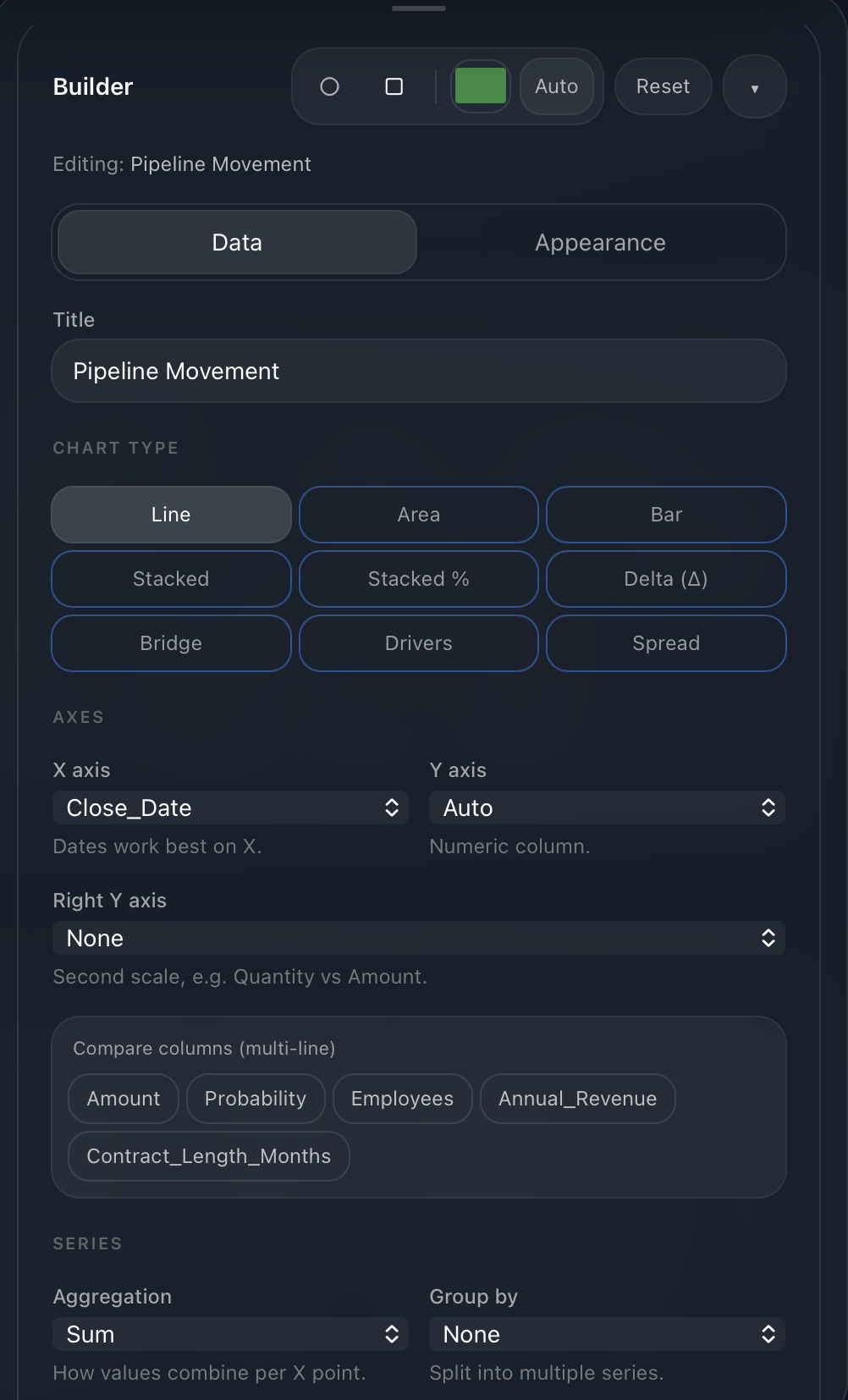 Line, Bar, Area, Stacked, Delta, Bridge, Drivers, Spread and more.
